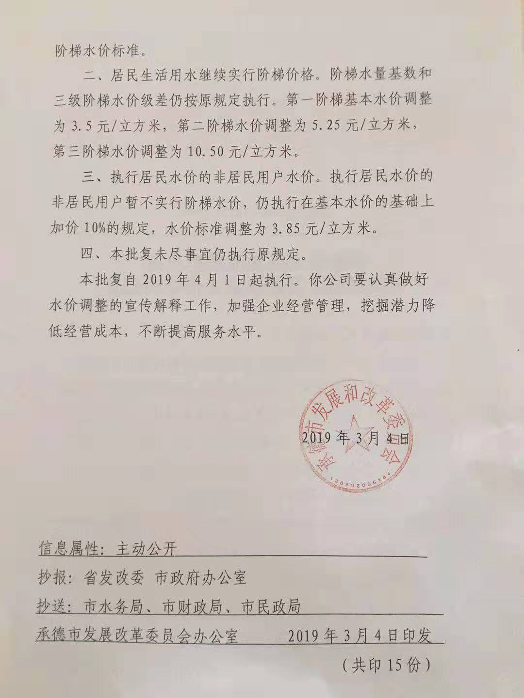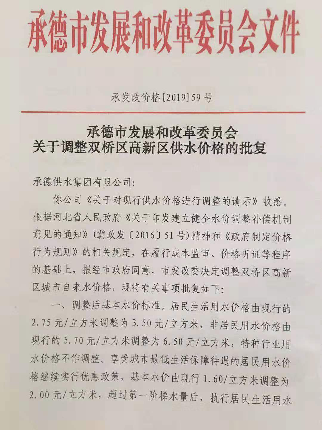 承德市發(fā)展和改革委員會關于調(diào)整雙橋區(qū)高新區(qū)供水價格的批復 承發(fā)改價格【2019】59號