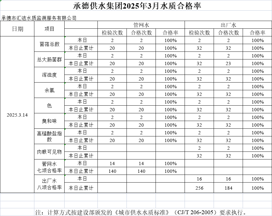 承德供水集團(tuán)2025年3月14日水質(zhì)合格率